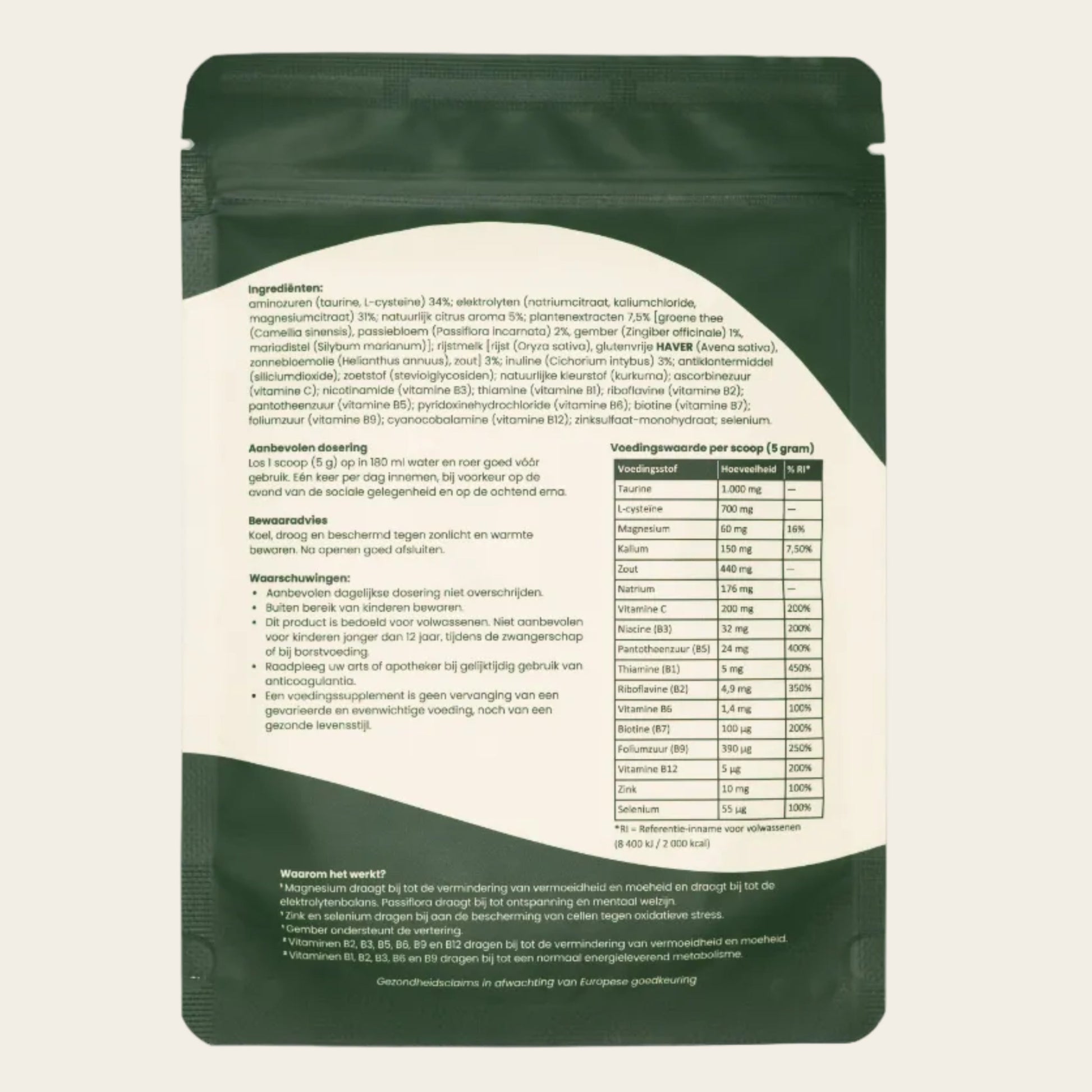 aminozuren (taurine, L-cysteïne) 34%; elektrolyten (natriumcitraat, kaliumchloride, magnesiumcitraat) 31%; natuurlijk citrus aroma 5%; plantenextracten 7,5% [groene thee (Camellia sinensis), passiebloem (Passiflora incarnata) 2%, gember (Zingiber officinale) 1%, mariadistel (Silybum marianum)]; rijstmelk [rijst (Oryza sativa), glutenvrije HAVER (Avena sativa), zonnebloemolie (Helianthus annuus), zout] 3%; inuline (Cichorium intybus) 3%; antiklontermiddel (siliciumdioxide); zoetstof (steviolglycosiden); natuurlijke kleurstof (kurkuma); ascorbinezuur (vitamine C); nicotinamide (vitamine B3); thiamine (vitamine B1); riboflavine (vitamine B2); pantotheenzuur (vitamine B5); pyridoxinehydrochloride (vitamine B6); biotine (vitamine B7); foliumzuur (vitamine B9); cyanocobalamine (vitamine B12); zinksulfaat-monohydraat; selenium.